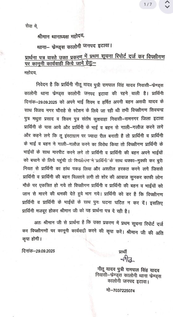 इटावा। सोशल मीडिया पर चर्चित यूट्यूबर अशवी यादव के भाई पर गुरुवार की रात जानलेवा हमला हुआ। हमलावरों ने लाठी, सरिया और धारदार हथियारों से हमला कर उसे लहूलुहान कर अधमरा हालत में छोड़ दिया। पुलिस ने घायल को अस्पताल भिजवाकर मुकदमा दर्ज कर लिया है।पीड़ित शिवम यादव ने बताया कि 29 सितंबर को अपनी बहन अशवी यादव और नीतू यादव के साथ विजयनगर से स्टेशन की ओर जा रहे थे। रास्ते में कुछ लोगों ने अशवी यादव पर इंस्टाग्राम पर रील बनाने को लेकर गाली-गलौज और अभद्रता की।