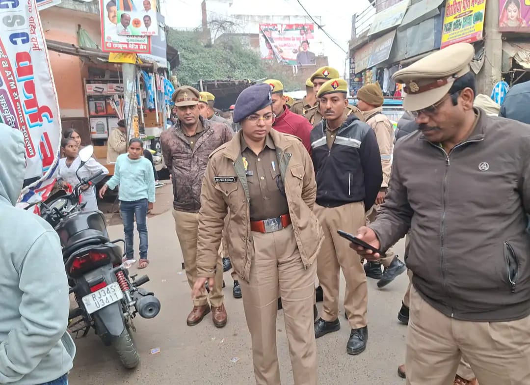 जसवन्तनगर ,इटावा। जसवंतनगर में जाम की गंभीर समस्या से निपटने के लिए क्षेत्राधिकारी आयुषी सिंह ने पुलिस बल के साथ सदर बाजार में पैदल मार्च किया। इस दौरान संदिग्ध वाहनों की जांच की गई और यातायात नियमों का उल्लंघन करने वालों पर सख्त कार्रवाई की गी।
